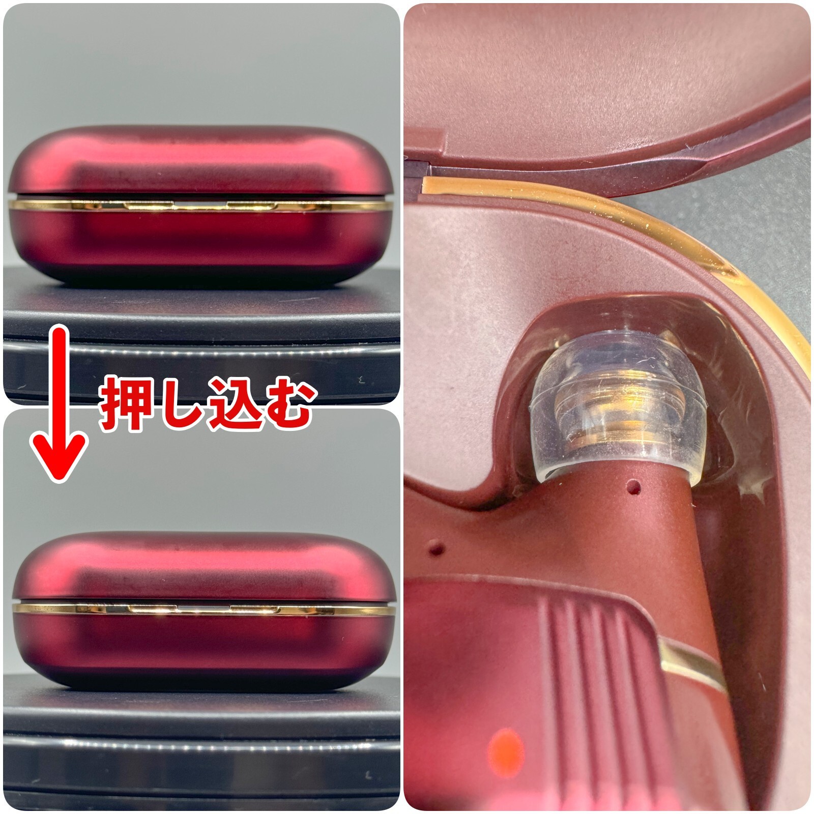 高さがあるために、ケースに入れた状態でも常にイヤーピースがケースに当たってしまっていますし、蓋を押し込んだとしてもイヤーピースに押し戻されてしまい蓋がしっかり閉まりません。
