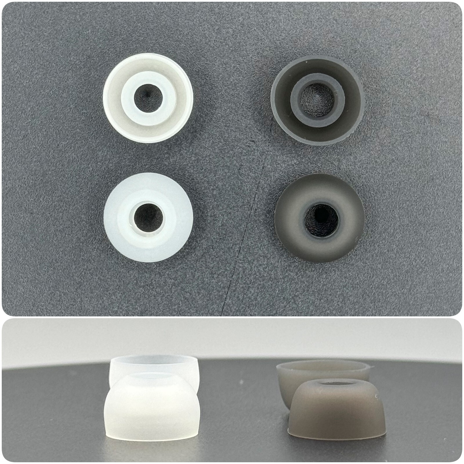 VELVET WHITEはBLACKと同じくサラサラな触り心地と汚れのつきにくさが特徴ですが、軸がイヤーピースの高さに対して半分程度しかなく、ANIMAのANW01やSoundpeats MiniシリーズといったコンパクトなTWS向けのイヤーピースとなっています。「for TWS」と、TWS向けをアピールはしてますがBLACKの方が相性のいいものもありますので、お使いのTWS付属のイヤーピースの軸の長さを見てどっちを使った方がいいか選ぶといいかも。